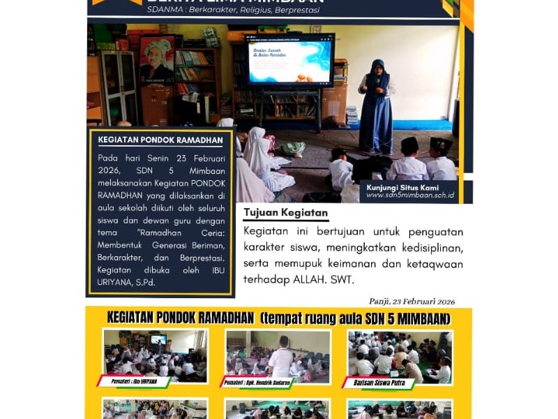 Pada hari Senin 23 Februari 2026 SD Negeri 5 Mimbaan melaksanakan kegiatan Pondok Ramadhan yang dilaksanakan di Aula sekolah diikuti oleh seluruh siswa dan dewan guru dengan tema "Ramadhan Ceria" : Membentuk Generasi Beriman, Berkarakter, dan Berprestasi. Kegiatan ini dibuka Oleh Ustada Uriyana, S.Pd.